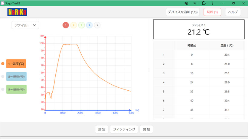 温度センサは3本まで同時に接続することができ、条件を変えて比較することができます。
